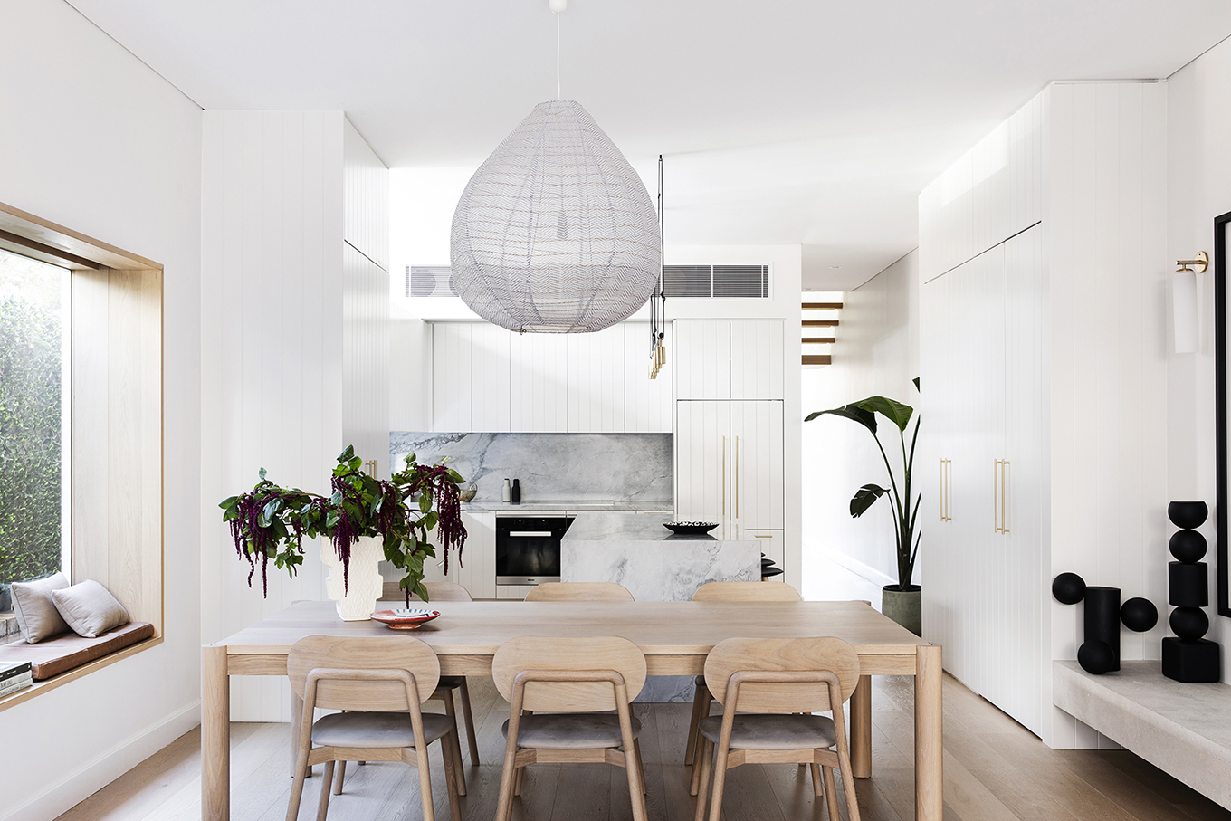 受建筑和沿海地區的啟發,室內設計師Lara Ette繪制了一個調色板,該調色板似乎直接取自邦迪海灘本身。蒼白的木材讓人想起白色的沙灘,而質感的石頭讓人想起懸崖。通過選擇關鍵的家具(例如客廳中的粉紅色扶手椅),飾面(例如白云石臺面和白色石灰石浮動底座)以及強調手工元素,平衡了這種輕柔,平靜的物質感,她增加了豐富感和活力。 ,例如Articolo和Marz Designs的照明。