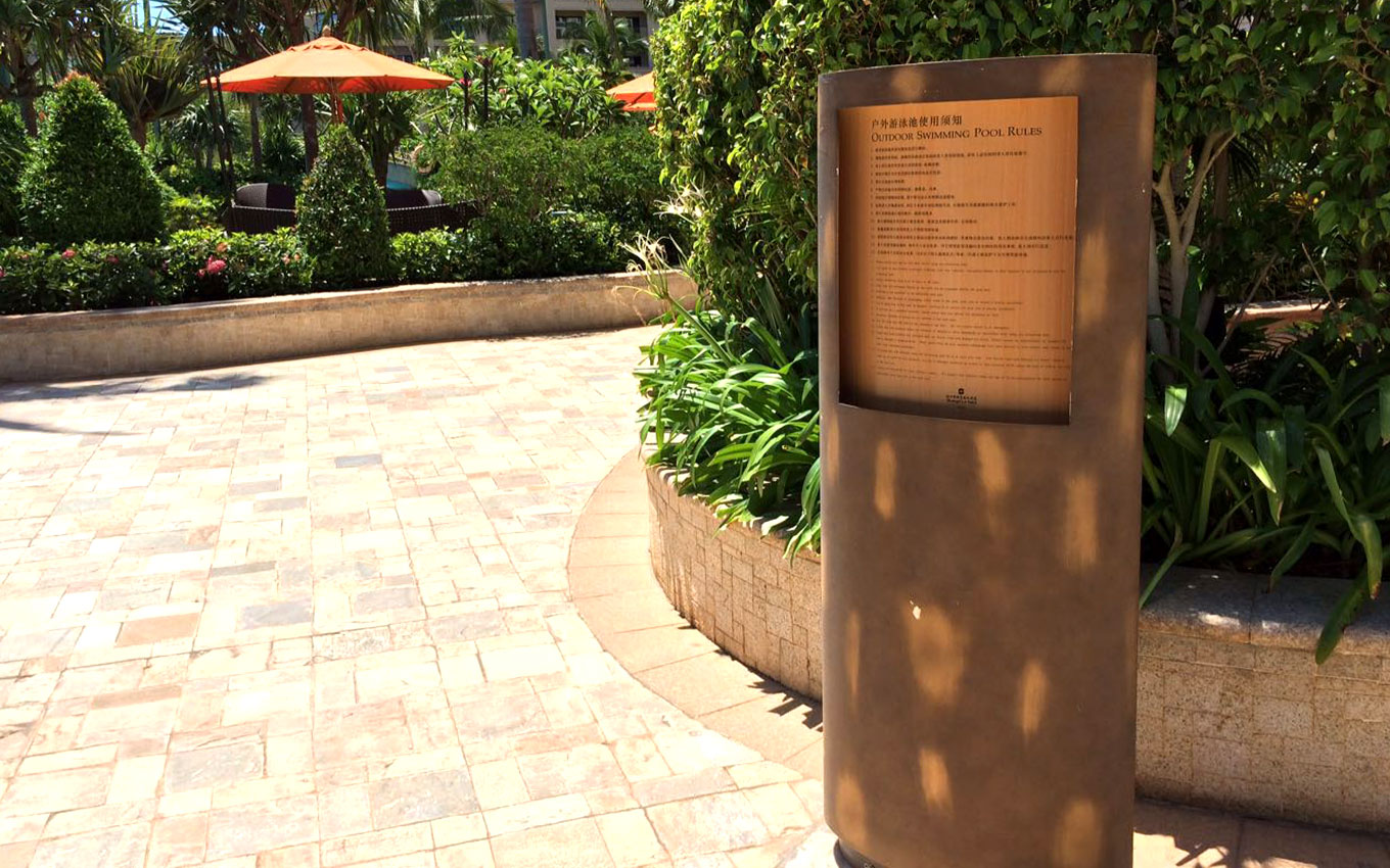 海口香格里拉大酒店位于海口市度假中心,海邊的天然美景、海岸線的風(fēng)光、椰風(fēng)的靜謐之處、這是海口度假天堂,海口香格里拉大酒店標識設(shè)計以海洋、海口椰樹風(fēng)光為設(shè)計創(chuàng)意,室外以古銅打造陽光下的度假方案導(dǎo)視設(shè)計,室內(nèi)以沙石雕花邊工藝制作,結(jié)合金屬質(zhì)感的點綴,形成鮮明的品質(zhì)感。